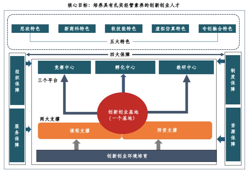 “5”—— 五大特色:思政特色、新商科特色、软技能特色、虚拟仿真特色、专创融合特色