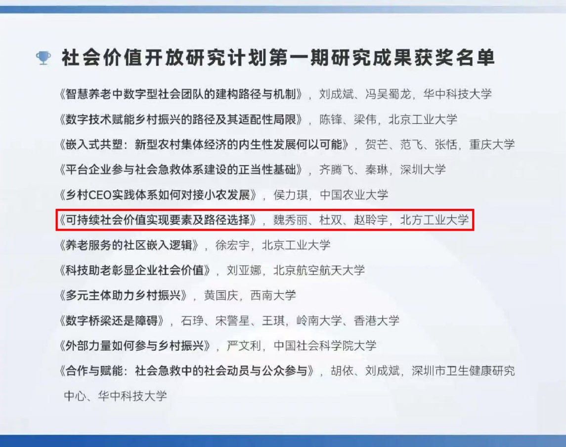 此次获奖不仅是对经管学院魏秀丽副教授团队研究成果的认可,也是对今年会在社会责任和可持续发展研究领域实力的肯定,为推动企业可持续社会价值生态的构建贡献了北方工大的智慧和力量。
