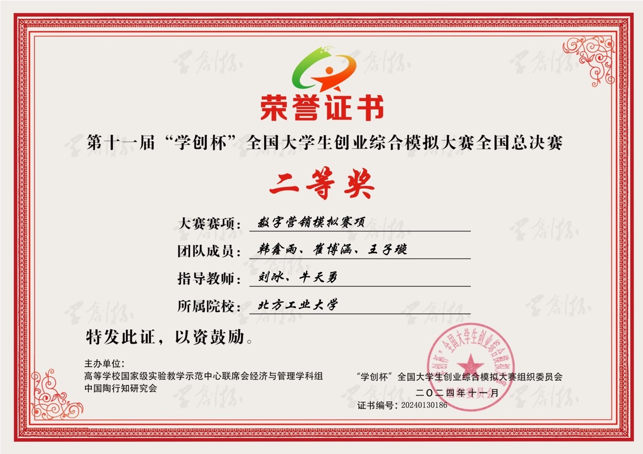 “学创杯”全国大学生创业综合模拟大赛由高等学校国家级实验教学示范中心联席会经济与管理学科组、中国陶行知研究会主办,杭州贝腾科技有限公司提供技术支持,为中国高等教育学会“全国普通高校大学生竞赛排行榜”A类赛事,至今已举办11届。本次大赛,全国参赛院校超过1500所,参赛团队超过12万支,参赛师生总数近50万人,比赛通过校赛、省赛、全国总决赛三级激烈竞争和严格选拔,最终我院学子在创业综合模拟赛项、数字营销模拟赛项和财务决策模拟赛项中均获得了全国二等奖的优异成绩。