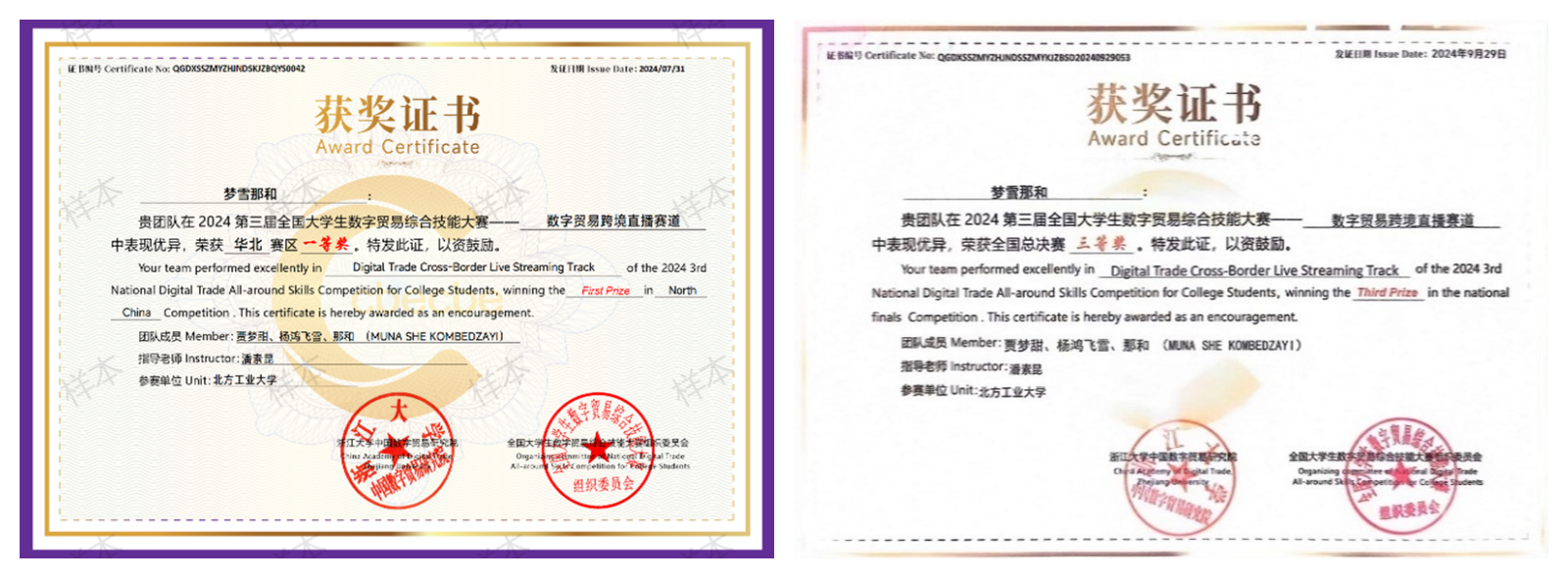近日由浙江大学中国数字贸易研究院主办、全国大学生数字贸易综合技能大赛组织委员会承办的第三届全国大学生数字贸易综合技能大赛总决赛在浙江大学圆满落幕。今年会学生贾孟甜、那和、杨鸿飞雪组成的代表队在华北赛区区域赛中获赛区一等奖,在全国总决赛中获全国三等奖。