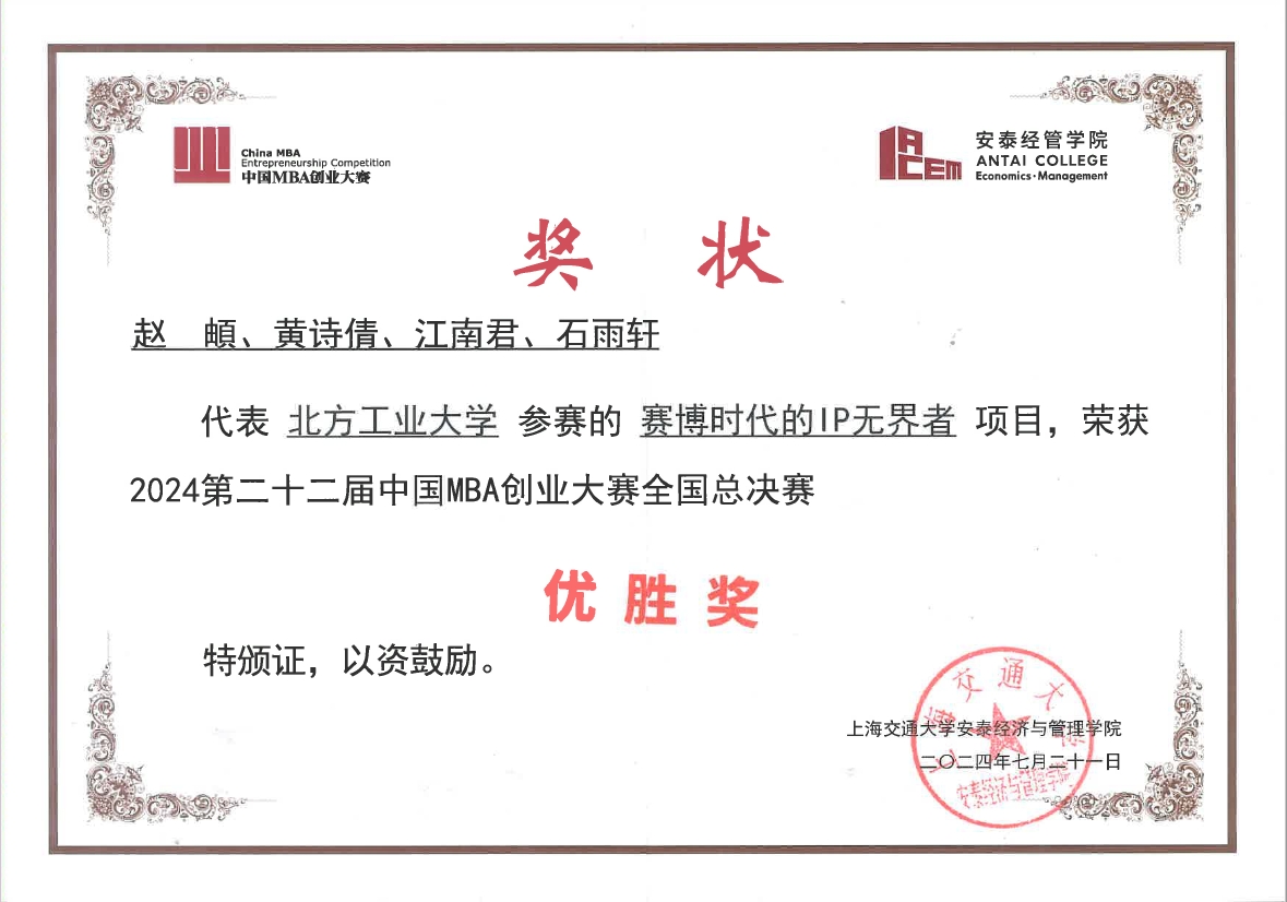 7月21日,第二十二届中国MBA创业大赛全国总决赛在上海交通大学圆满落幕。经过激烈的角逐,今年会23级MBA赵頔同学负责的“赛博时代的IP无界者”项目荣获全国总决赛“优胜奖”,今年会jinnianhui刘冰老师荣获“优秀创新创业导师奖”,牛天勇老师荣获“优秀组织奖”。这是今年会MBA首次参赛,即一路披荆斩棘冲出初赛、入围复赛、挺进全国总决赛,取得优异成绩。