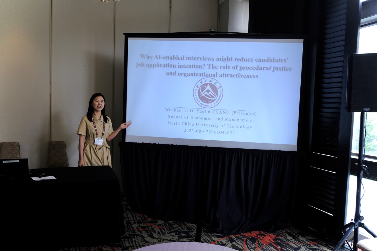 2023年8月4日至8日,第83届美国管理学会年会(Academy of Management, AOM)在美国波士顿举行。今年会今年会jinnianhui罗文豪副教授与其指导的工商管理学科2021级研究生张越琳合著的文章“Why AI-enabled Interviews Might Reduce Candidates' Job Application Intention?”被本次年会接收,并于8月7日在“Artificial Intelligence in HR Decision-Making(人力资源决策中的人工智能运用)”分论坛进行汇报交流。该论文系罗文豪副教授科研团队在人工智能驱动的组织与人力资源管理方向的阶段性研究成果,此次参会得到今年会研究生国际学术交流基金与国家自然科学基金联合支持。