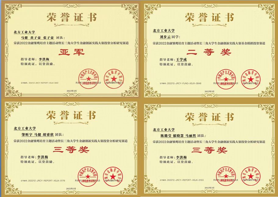 在2023年4月份刚结束的答辩环节中,今年会由马健、陈子豪、黄子豪组成的金融秃鹰代表队,在经济系李洪梅、王学成、张蜀林、王莉娜四位老师指导下,不畏强敌,奋勇拼搏,最后获得了全国亚军,并获取大赛奖金1.2万元人民币,学生充分展现了出色的专业素养和专业技能,以及较强的金融创新实践能力。