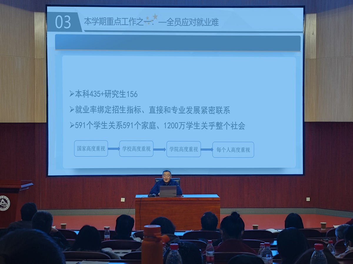 学院赵继新院长从就业和招生、就业和专业发展、就业和社会稳定等多个角度,强调了学院全员就业导师工作是学院全员育人计划的重要组成部分,关系到学院人才培养质量、关系到专业建设水平、关系到学生未来发展,各系教师要结合自身和学生工作联系的实际,提高政治站位,加强工作沟通,积极发挥自己在就业工作中的作用,形成工作合力,稳步推进学院就业工作。