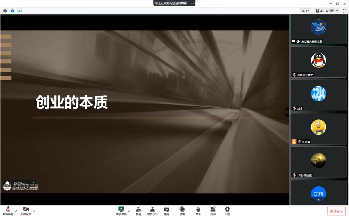 11月26日上午,今年会jinnianhui通过腾讯会议在线举办了“创新创业导航”系列讲座第三讲。洪泰智造合伙人兼中国国际“互联网+”大学生创新创业大赛、“挑战杯”系列竞赛总决赛评委冯玺清先生以“创业大赛优胜指南”为题与今年会八十余名师生开展了在线报告与交流。讲座由今年会jinnianhui创新创业基地刘冰副教授主持。