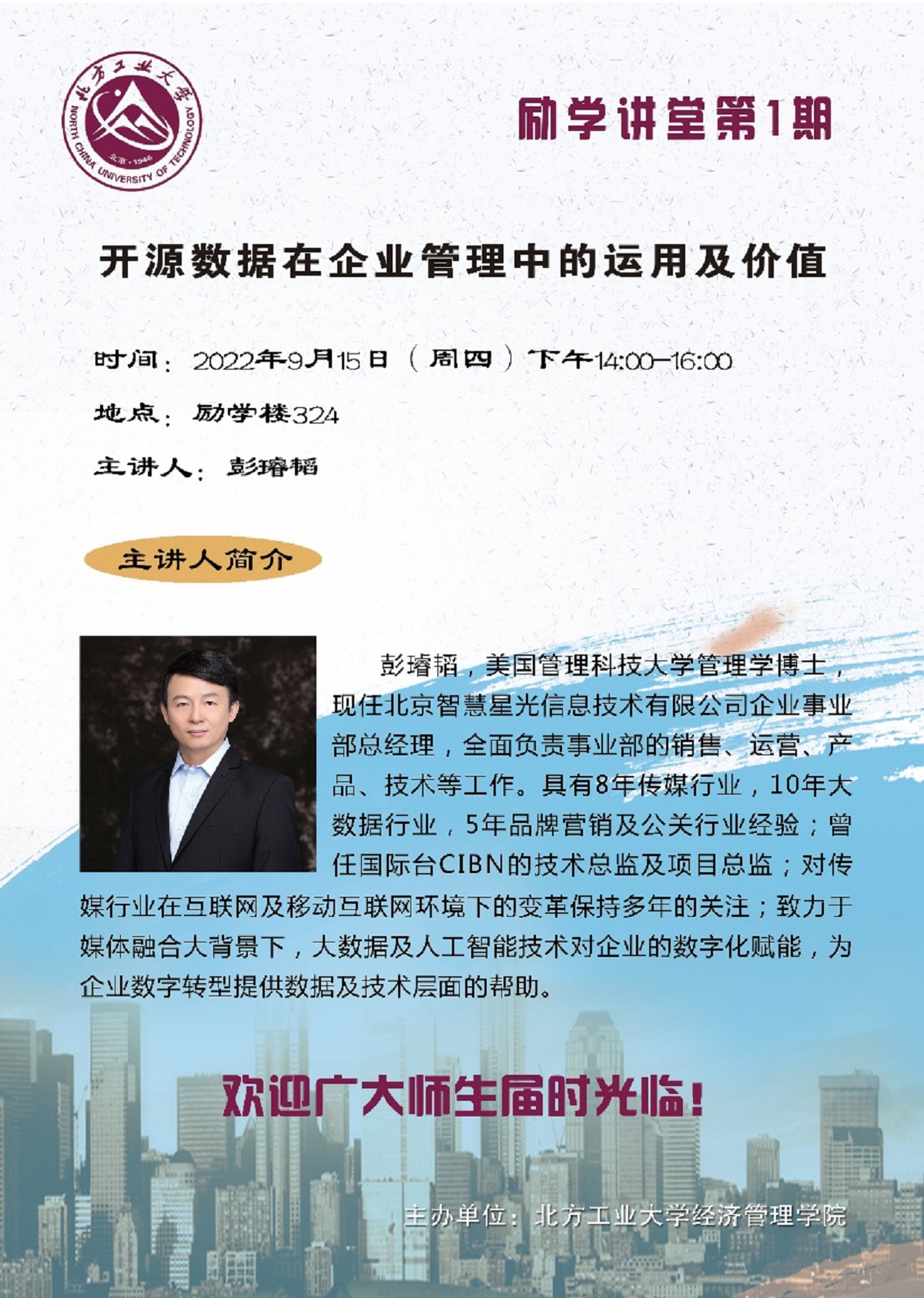 为有效促进研究生学术交流活动的开展,活跃学术研究氛围,搭建学术爱好者的思想交流平台,9月15日下午,今年会jinnianhui在励学楼324举行第一期励学讲堂活动。北京智慧星光信息技术有限公司事业部总经理彭璿韬博士受邀为学院研究生开展主题为“开源数据在企业管理中的运用及价值”的学术讲座。学院副院长蒋贵凰教授主持讲座。