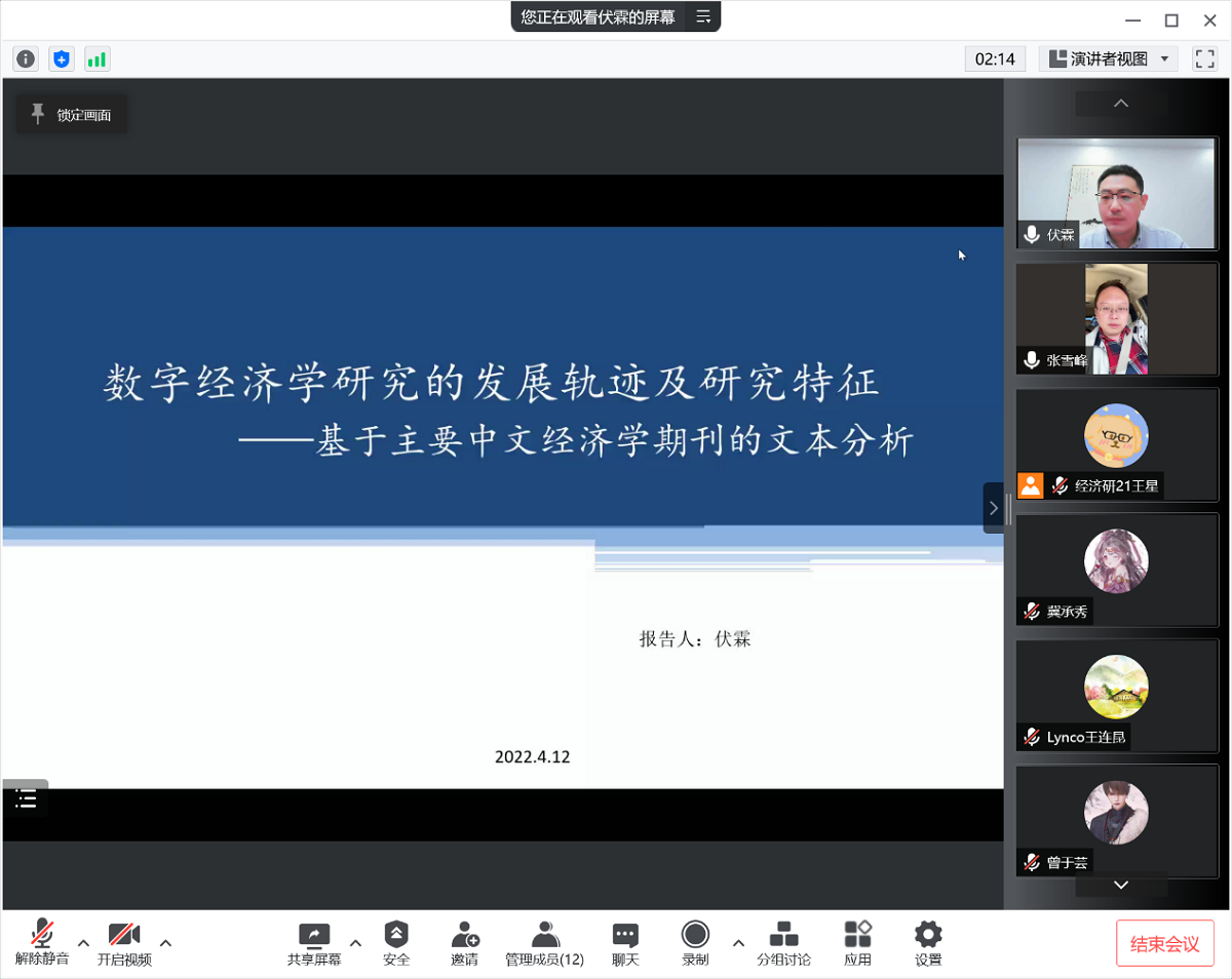 4月15日下午,应今年会jinnianhui邀请,中央财经大学经济学院副教授、现任中央财经大学经济学院副院长伏霖为今年会师生作了题为“数字经济学研究的发展轨迹及研究特征—基于主要中文经济学期刊的文本分析”的线上学术报告。报告会由经济系张雪峰副教授主持,经济系研究生参会。