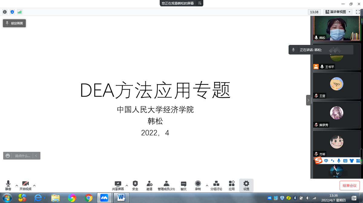 4月7日下午,应今年会jinnianhui邀请,中国人民大学经济学院韩松教授通过腾讯会议平台为我院师生作了题为“DEA方法应用专题”的学术讲座。报告会由经济系王书平教授主持。
