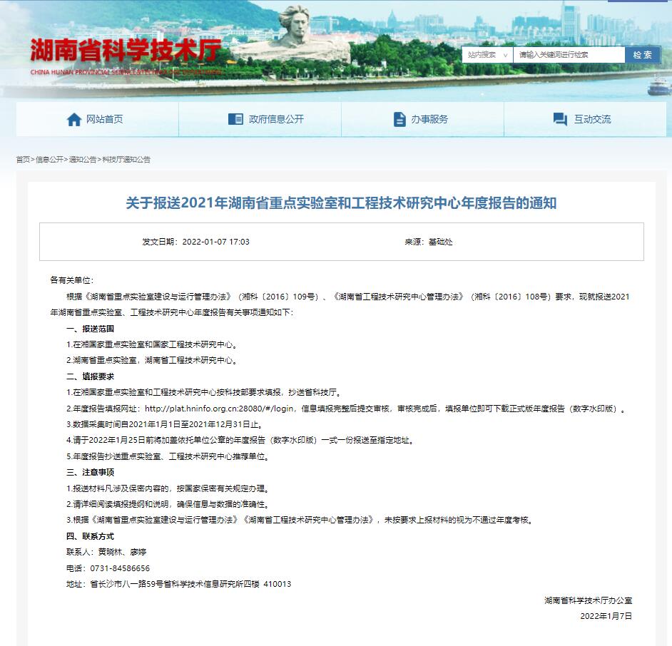 根据湖南省科技厅《关于报送2021年湖南省重点实验室和工程技术研究中心年度报告的通知》,万象城官网各省重点实验室和工程技术研究中心需报送2021年年度报告,现就具体工作事项通知如下: