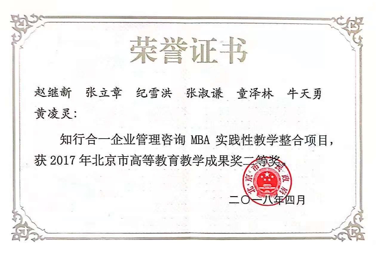 专业教师注重教学研究,2019年成功申报教育部工商管理教育指导委员会教育教学改革课题2项;近年获北京市教学成果二等奖2项;专业骨干课程《市场营销管理》为北京市级高等学校精品课程、北京市课程思政示范课程,《市场营销管理》教材被评为北京高等教育精品教材;《管理学》、《人力资源管理》为北京市优质本科课程;《管理学》被教育部工商管理教育指导委员会评为国家级“金课”。“组织与人力资源管理本科育人团队”获评北京高校优秀本科育人团队。