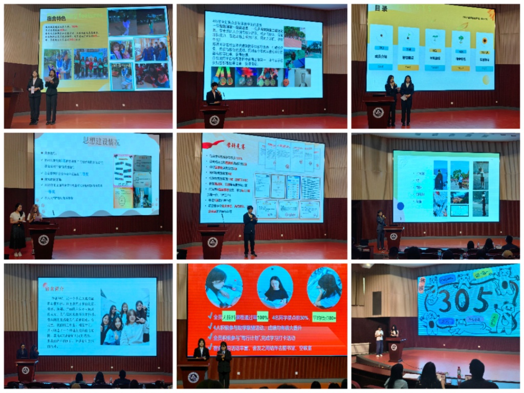 答辩环节,各宿舍成员从思想提升、环境卫生、学风营造、志愿服务、其他宿舍特色等多个方面进行展示,展现了同学们进取向上、团结友爱的精神风貌。