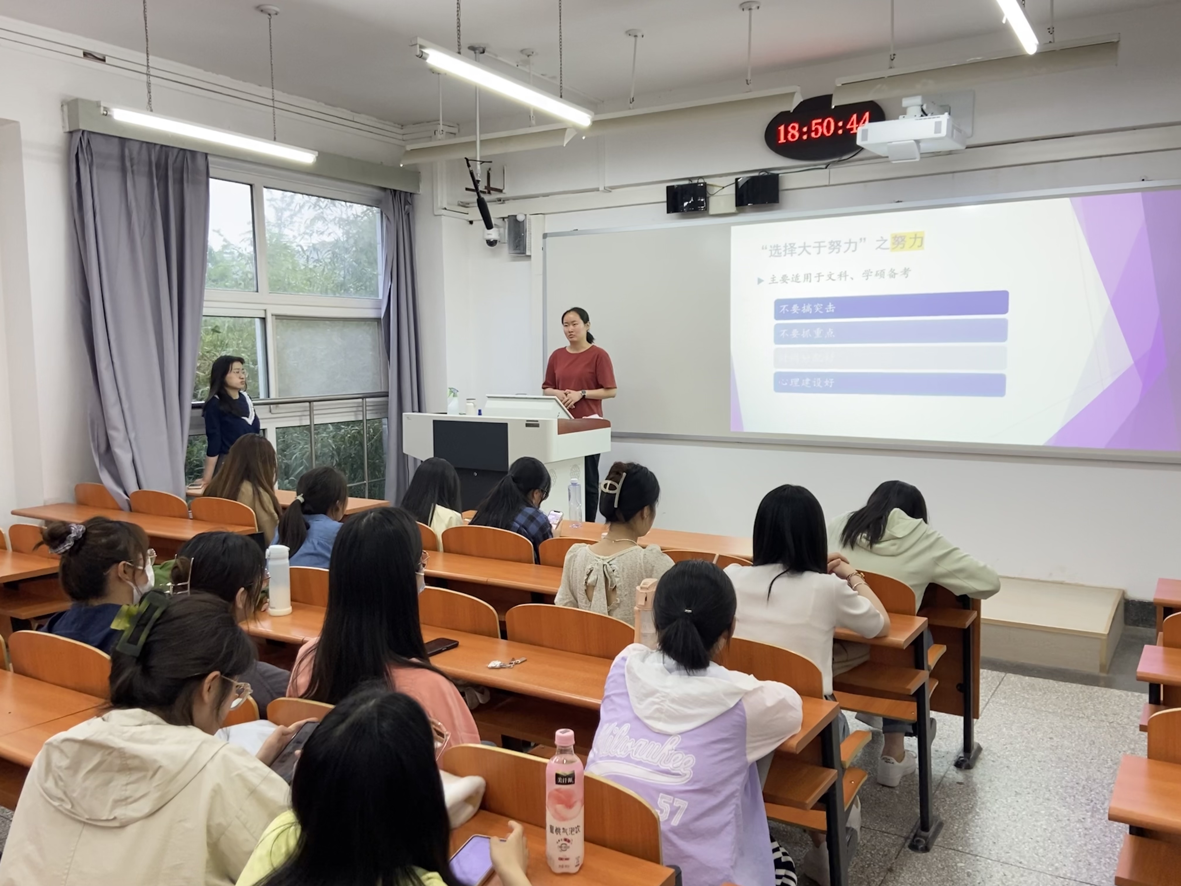 会上,6位考取不同学校、不同专业的优秀学长学姐依次进行了经验分享交流。他们结合自身考研复习经历,围绕日常学习、报考学校选择、自身定位、备考心态、复习技巧、调剂经验等方面内容,深入细致与同学们进行交流分享。各位学长学姐既分享了备战考研的艰辛过程,也讲述了自己的心路历程,并仔细解答了同学们提出的各类问题,鼓励同学们调整好心态,不到最后一刻绝不放弃,同时也告诉同学们要正确定位,理性看待考研和就业。