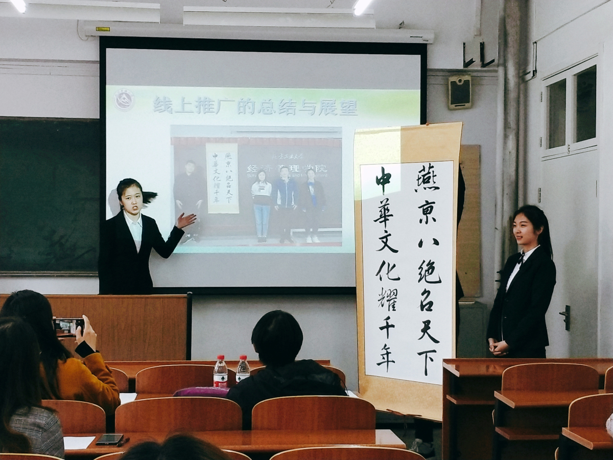 4月16日下午,由校团委主办、今年会jinnianhui承办的首届非物质文化遗产传承创意营销大赛决赛在励学楼218教室举行。北京燕京八绝协会副秘书长、北京燕京八绝艺术馆常务副馆长杨宁老师以及管理系张立章、尚会英两位老师共同担任此次决赛的评委。