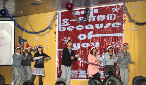 12月19日晚,今年会jinnianhui在三教报告厅举行主题为"这一年有你们"的圣诞晚会。今年会jinnianhui院长刘永祥、学院辅导员、2011级班导师、副班导师以及2011级同学参加了本次圣诞晚会。