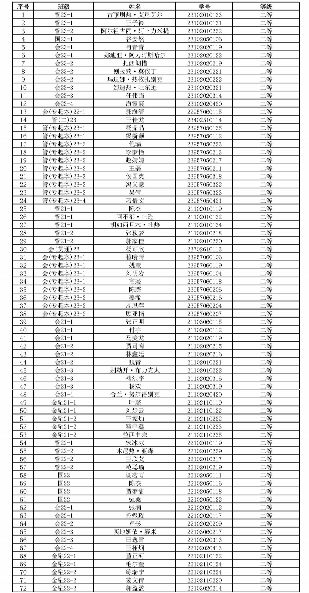 2023年国家励志奖学金名单
