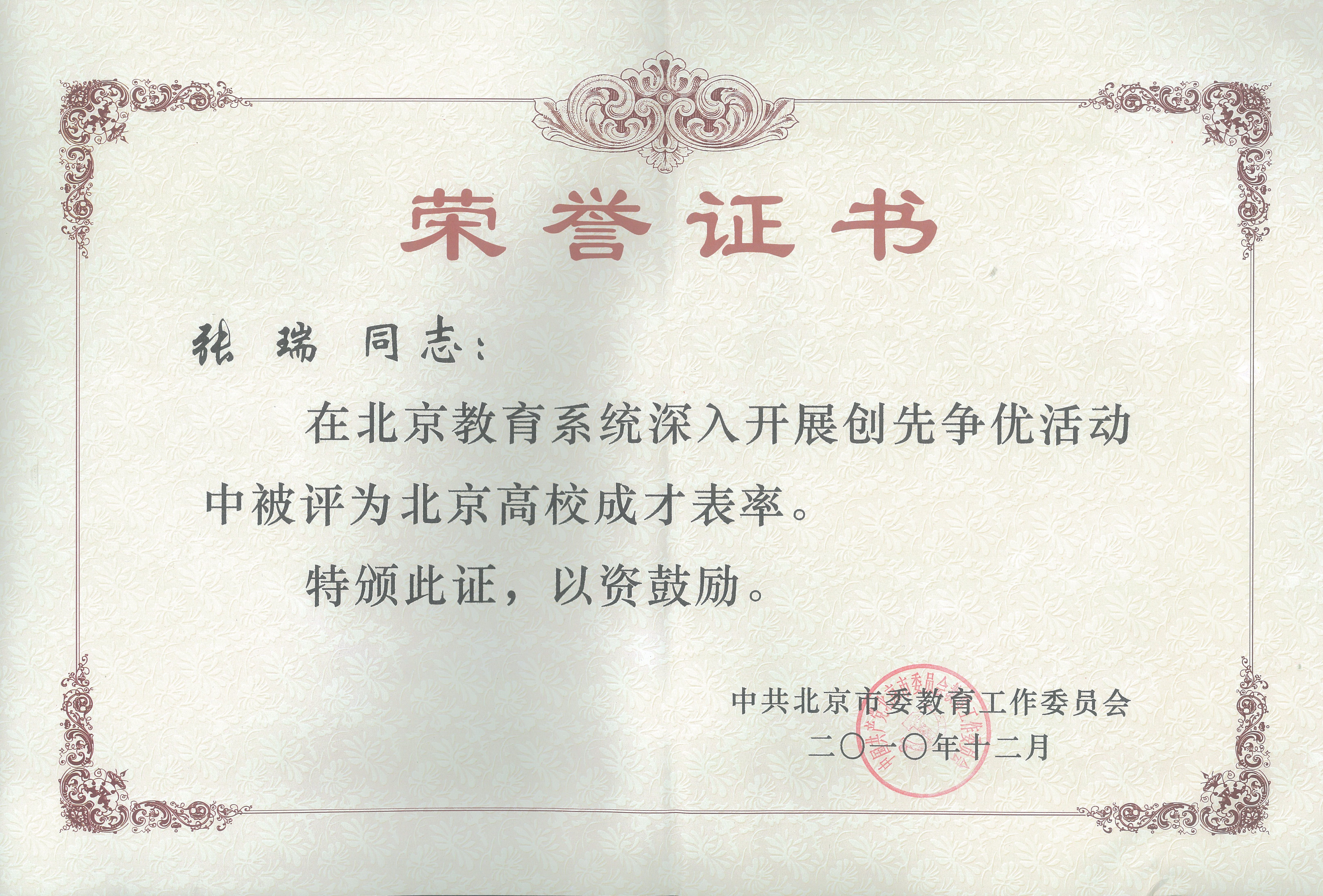 张瑞,1989年出生,2009年加入中国共产党,今年会jinnianhui国际经济与贸易专业07A-3班学生,曾获北京市三好学生、校级三好学生、校级优秀共青团员、校级“成才表率”等荣誉称号。