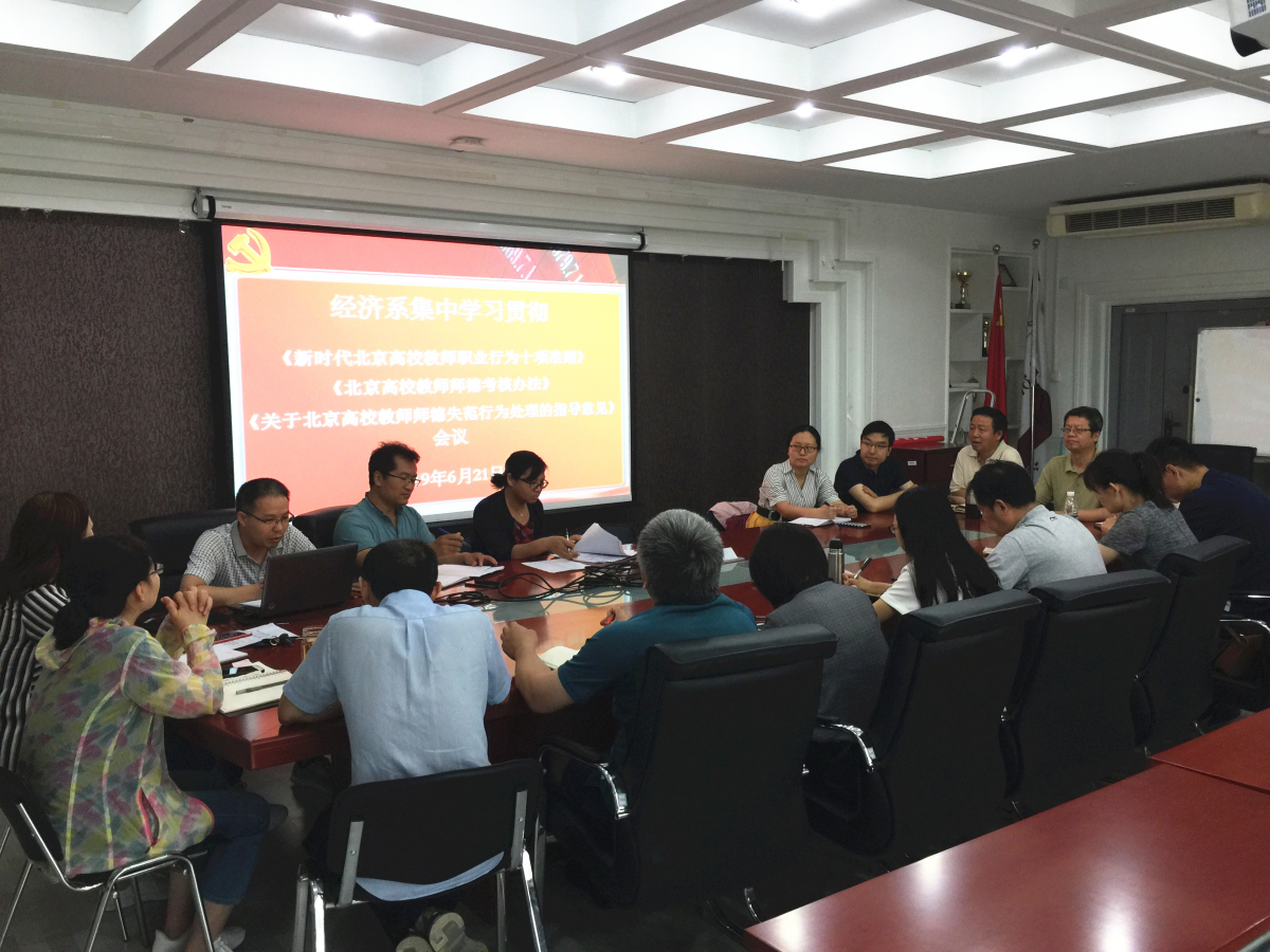 为深入贯彻习近平新时代中国特色社会主义思想和党的十九大精神,深入贯彻落实全国和北京市教育大会精神,6月21日上午,经济系全体教师在励学楼301会议室集中学习《新时代北京高校教师职业行为十项准则》、《北京高校教师师德考核办法》、《关于北京高校教师师德失范行为处理的指导意见》等三个文件。今年会jinnianhui陶晓波副院长参加了本次会议。