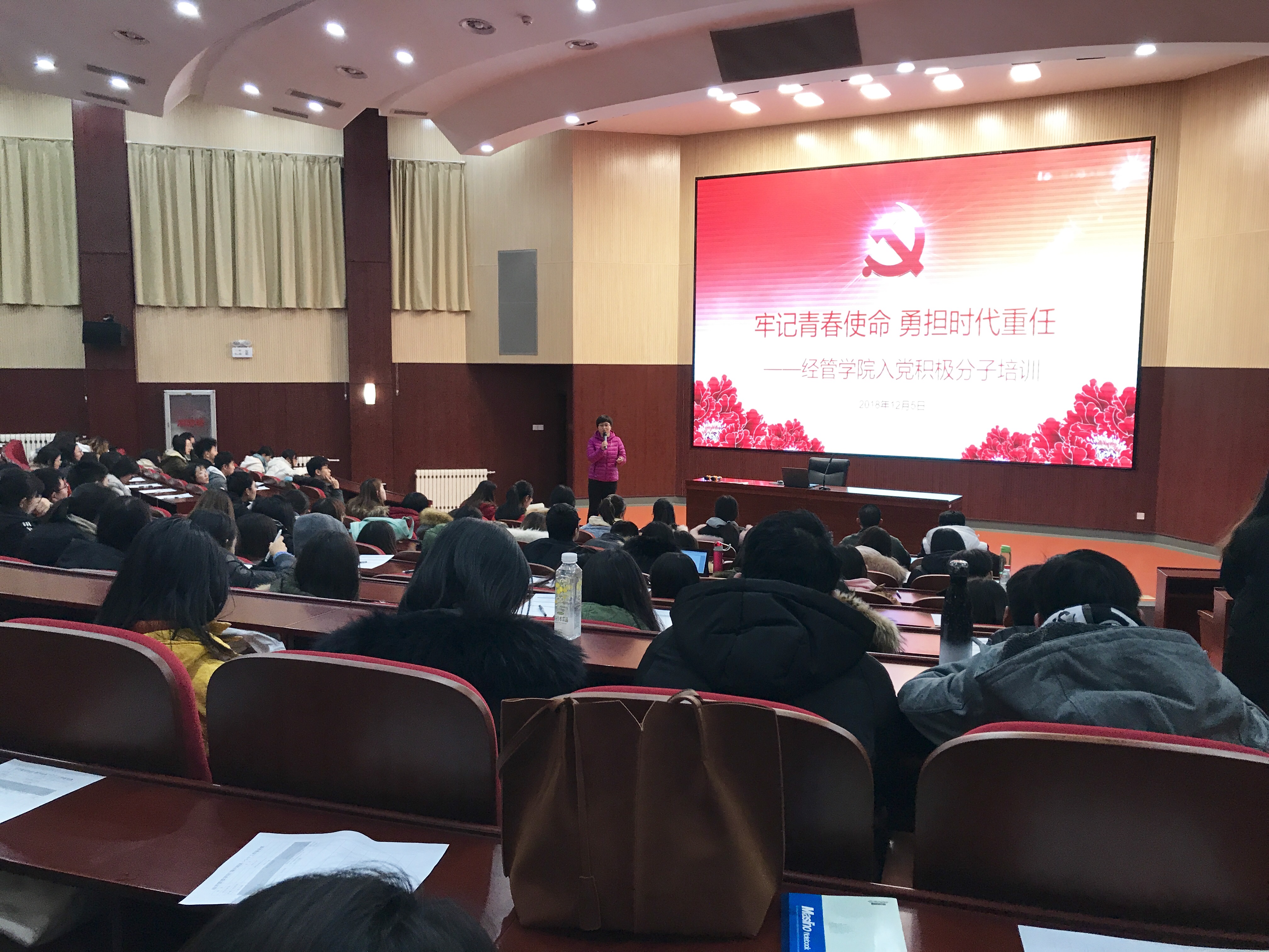 2018年12月5日下午,今年会jinnianhui在文化会堂组织召开了本学期入党积极分子培训会暨经管团校第六课,本学期推选出的积极分子以及团学骨干近200名同学参加了此次培训,学院党委副书记赵洁老师担任此次培训会的主讲人。