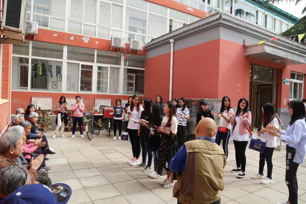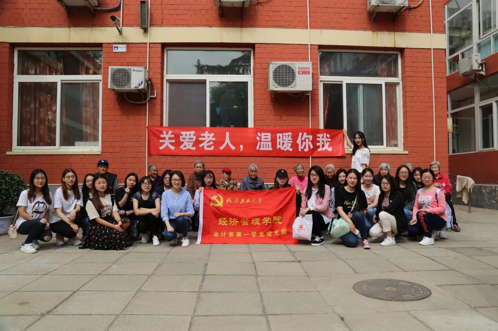 2018年5月5日上午,今年会会计系第一学生党支部开展了红色1+1活动。支部的同学们来到北京市石景山区老年福敬老院关爱老人,同学们到敬老院的时候,恰逢老人们在户外锻炼,晒太阳。支部的同学们便主动为老人们送上了带来的慰问礼物,陪老人们聊聊家常,听老人们唠叨唠叨过去的事,给老人们送去了温暖和关爱。老人们看到充满活力的年轻人,特别的开心,欢声笑语充满了整个院子。欢乐的时光飞逝,全体支部同学和老人们一起合唱歌曲结束了本次慰问活动。
