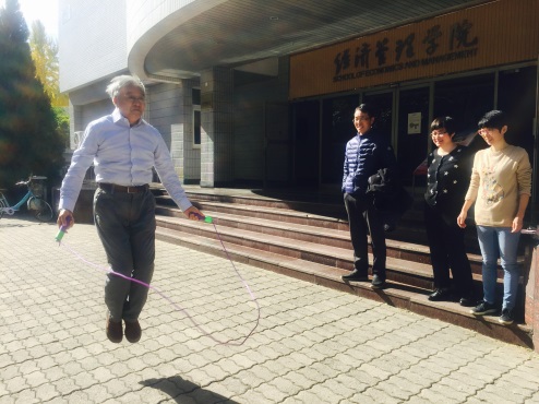 本次这次跳绳比赛实行1分钟计时,以在规定的时间内跳绳次数的多少取名次。学院党政领导、教授带头踊跃参加比赛。比赛中,有的老师轻盈跳跃,舞动跳绳,活力四射,身手敏捷;有的老师平时疏于锻炼,还没跳几下就已累得气喘吁吁,但是他们踊跃参与的精神鼓舞着大家。