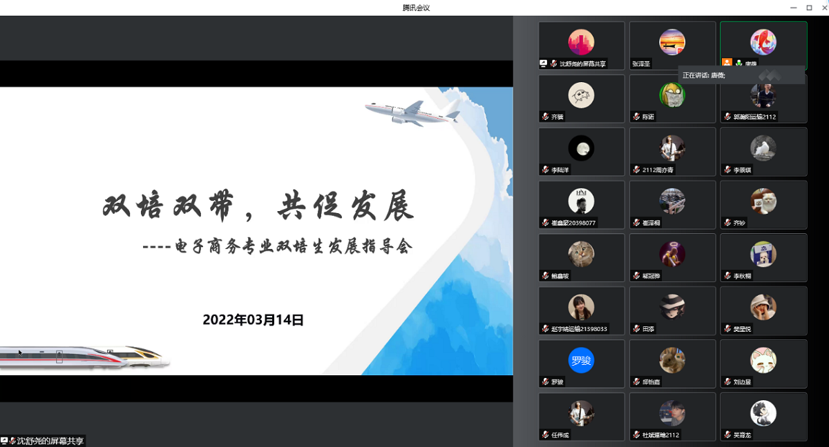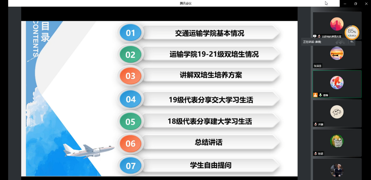 会上,唐薇主任介绍交通运输学院发展沿革、专业设置、本科生培养以及19-21级双培生在校期间的学习生活就业等情况,今年会jinnianhui党委副书记赵洁老师在课程学习、疫情防控等方面对学生做出指导,经管学院副院长陶晓波老师解读了新修订的双培生培养方案,18级、19级双培生代表分享在交大的学习生活。会议最后的提问环节,各位参会老师对学生比较关心的学分认定、课程替换、考研等问题进行解答。最后,唐薇主任进行总结,鼓励所有同学珍惜北交大、北方工大两个平台资源,继续为自身和学校发展贡献力量。
