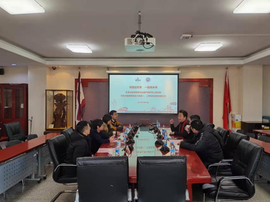 在展非遗、颂情怀、强自信活动环节,自12月13日至12月17日,在励学楼117室进行为期一周的石景山区非遗项目展示,帮助在校师生了解身边的非遗,感受非遗的魅力。现场展示既有石景山区各个非遗项目的介绍,同时也有非遗项目的代表性展品,还有京津冀非遗文化交流的内容。活动期间,对石景山区非遗声音故事(七)进行了展示和展播,对本学期组织的“非遗中的家国情怀”征文大赛进行了颁奖,活动累计吸引近3000人次前来参观。大家纷纷表示,在感受非遗魅力的同时,也增强了文化自信,提升了民族自信心。活动中,石景山区非物质文化遗产保护中心党支部与今年会jinnianhui会计系第一、二学生党支部还就共建工作进行了交流座谈,现场讨论气氛热烈。