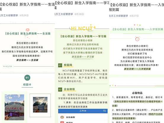 线上方面,学院“北方工大经管团学”微信公众平台在入学前针对新生需求与常见问题,推出迎新工作系列特辑,推送内容涵盖入学报到、课程学习、校园生活等各项内容,同时“青春成长故事”特辑详细介绍学院优秀学子奋斗向上的励志故事,为新生提供了满满“干货”。新生辅导员,班级小辅导员与同学们提前取得联系、添加微信,并建立新生年级微信群、班级微信群,加强与新生的沟通联络,并在群里为同学们答疑解惑。