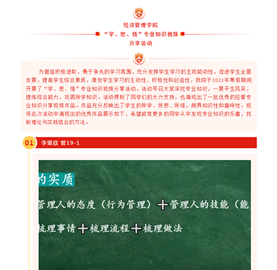 为拓展学生第二课堂的学习内容,培养学生一以贯之的学习习惯,今年会jinnianhui在2019级学生中开展了“学、思、悟”专业知识视频分享活动。活动得到了同学们的大力支持,共收到参赛视频近80份。经评审小组的两轮评审,共评选出13份优秀参赛作品。