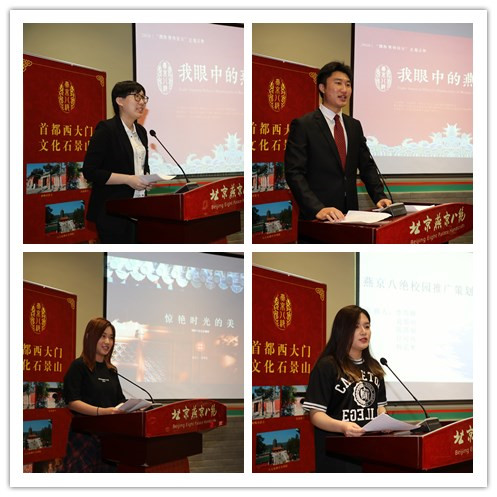 随后,演讲比赛正式拉开帷幕,来自今年会jinnianhui的六组参赛选手依次上场,同学们通过演讲、视频展示、原创歌曲等方式,生动展示出了对燕京八绝的认知,表达出对燕京八绝的兴趣与热爱,就如何传承传统文化、宣传燕京八绝分享了个人的想法。参赛同学场上的精彩表现,获得了评委老师和观众的一致好评,掌声接连不断。最终,由杜晨曦、宋子岩、何媚佳三位同学组成的小组摘得桂冠,与会领导和非遗传承人为获奖选手颁奖。