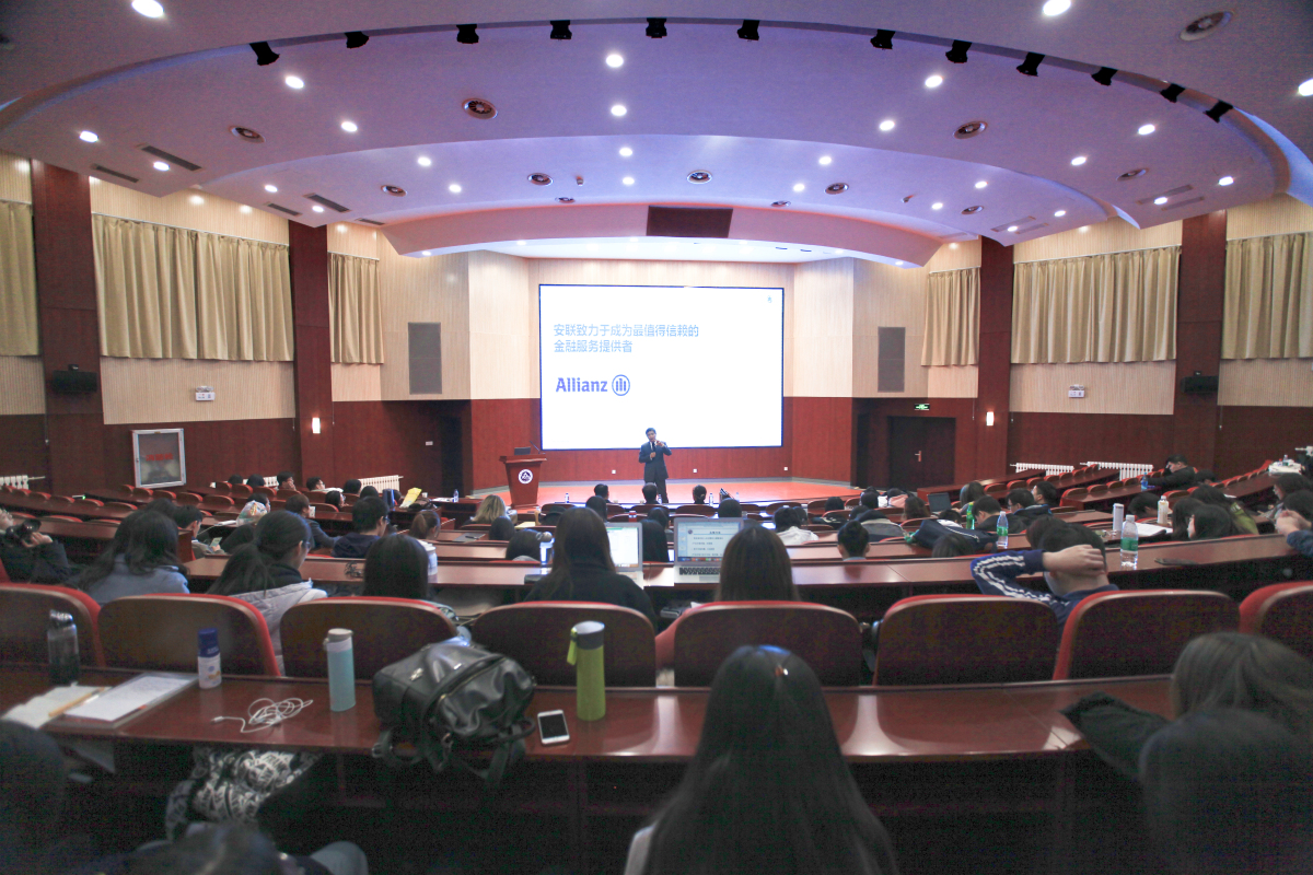 讲座之后,胡东校友所在公司——中德安联人寿保险有限公司北京分公司人力资源总监崔艳超向同学们介绍了公司的发展史、规模、招聘岗位等信息,面向同学们进行了现场求职咨询和招聘。