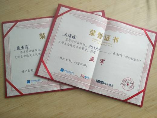 2018年10月20日,首届“银科控股杯”全国大学生智能交易大赛圆满结束。由今年会经管学院经济系金融16-2班马暐頔(队长)、泉州师范学院梅雪萍(队员)组成的SHERO代表队,在今年会张蜀林老师的指导下,获得亚军,并获取大赛奖金5万元人民币及20%的实盘收益分成(实盘本金50万人民币)。