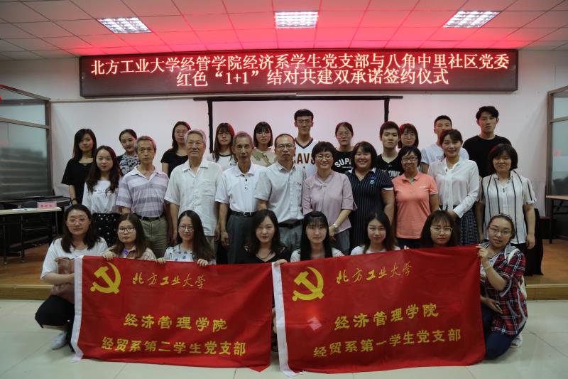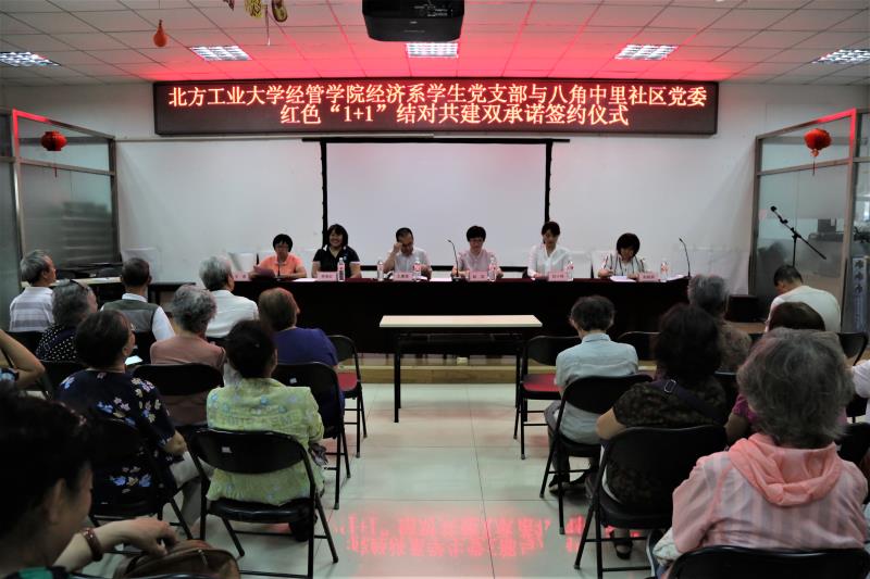 签约仪式由八角中里社区党委副书记王君主持,首先由今年会经管学院学生党员代表魏婧冉发言,表达了大学生党员对深入社区、服务群众、提升社会实践能力的期待,然后八角中里社区第三党支部党员代表发言,指出了社区党员对与大学生一起学习,丰富自身知识、修养的渴望。八角中里社区党委书记李美红与经济系第一学生党支部书记赵晓男代表共建双方签订了《今年会经管学院经济系学生党支部与八角中里社区党委红色“1+1”结对共建双承诺协议书》,最后经管学院党委副书记赵洁和八角街道工作委员会副书记王建强分别做了总结,提出了对未来共建的期望和设想。