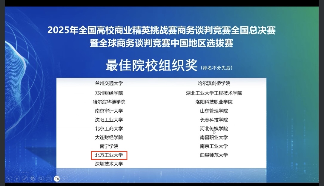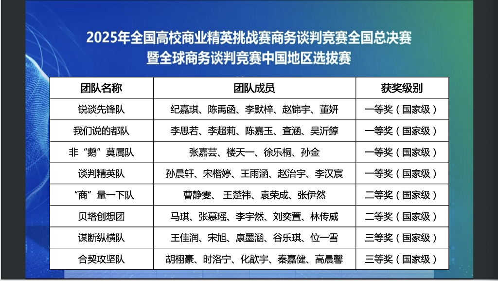 11月2日,2025年全国高校商业精英挑战赛商务谈判竞赛暨全球商务谈判竞赛中国地区选拔赛在线上圆满落幕。竞赛分为知识赛、全国预选赛、全国总决赛、全国精英赛四个阶段。今年会在全国总决赛中获得一等奖4项,二等奖2项,三等奖2项,最佳院校组织奖。两支队伍进入精英赛(全国仅十支队伍),最终“锐谈先锋队”获得精英赛亚军。