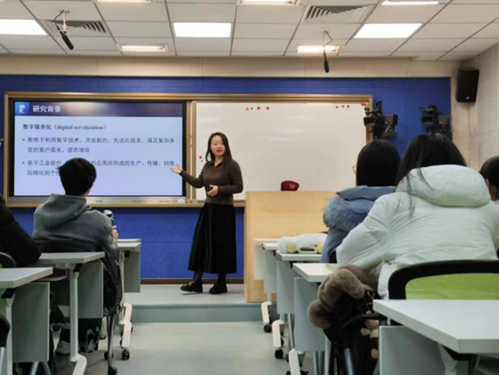蒋阳阳老师从研究背景、研究问题、数字服务化发展路径、数字服务化管理要素这四个方面分享了自己对制造企业数字服务化的研究。在与同学们的互动中让同学们深刻理解了数字化与服务化的关系,并通过分享自己研究团队的文献分析结果,展示出当前的热点研究方向、研究价值和相关研究的意义。