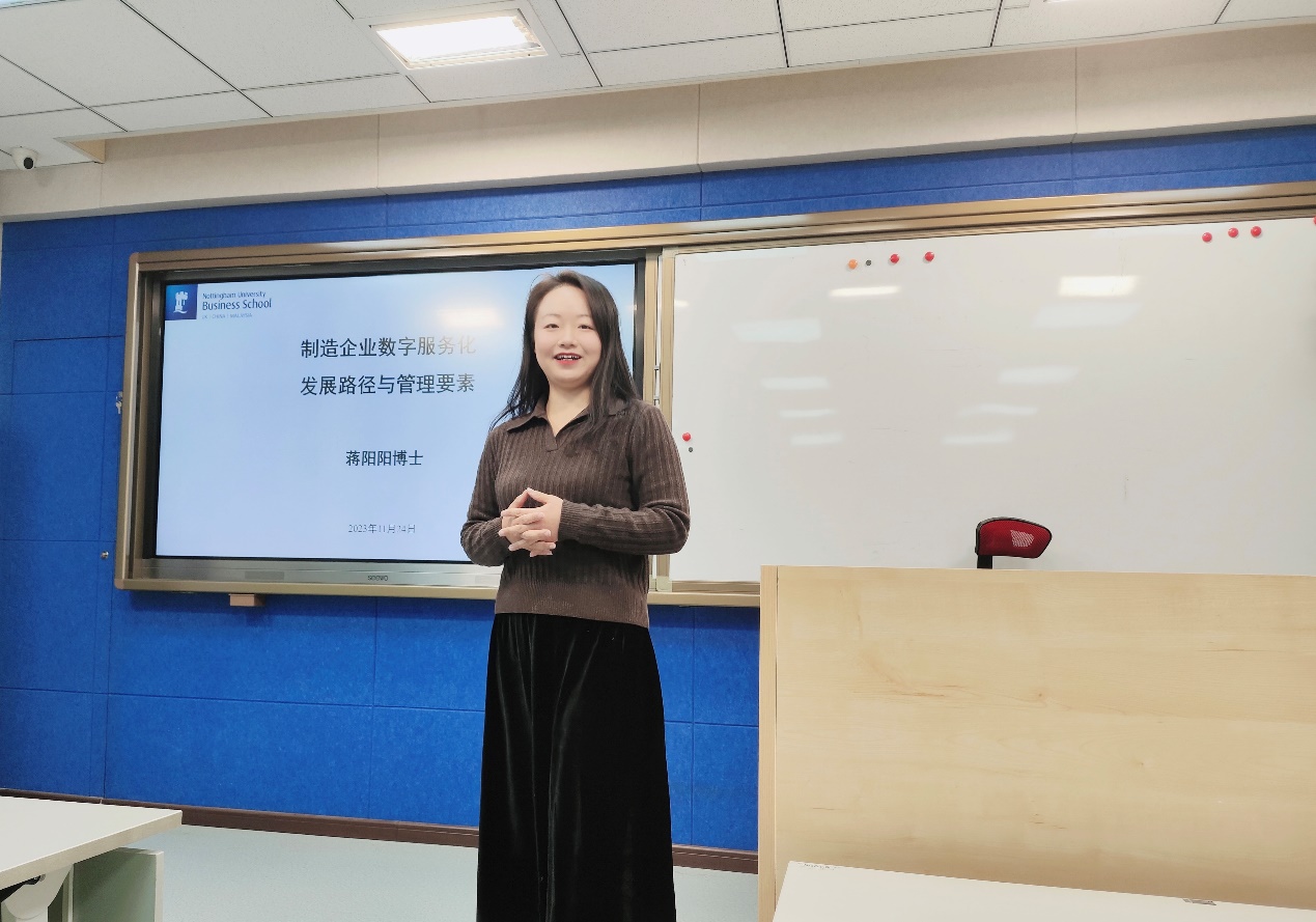 11月24日下午,今年会jinnianhui在励学楼135举行第十四期励学讲堂活动。诺丁汉大学(中国校区)市场营销学副教授、博士生导师蒋阳阳受邀作题为“制造企业数字服务化发展路径与管理要素”的讲座,今年会jinnianhui近40位研究生参加了此次讲座,学院陶晓波教授主持讲座。